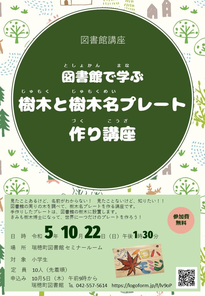 見たことあるけど、名前がわからない!見たことないけど、知りたい!図書館の周りの木を調べて、樹木プレートを作る講座です。手作りしたプレートは、図書館の樹木に設置します。きみも樹木博士になって、世界に一つだけのプレートを作ろう!