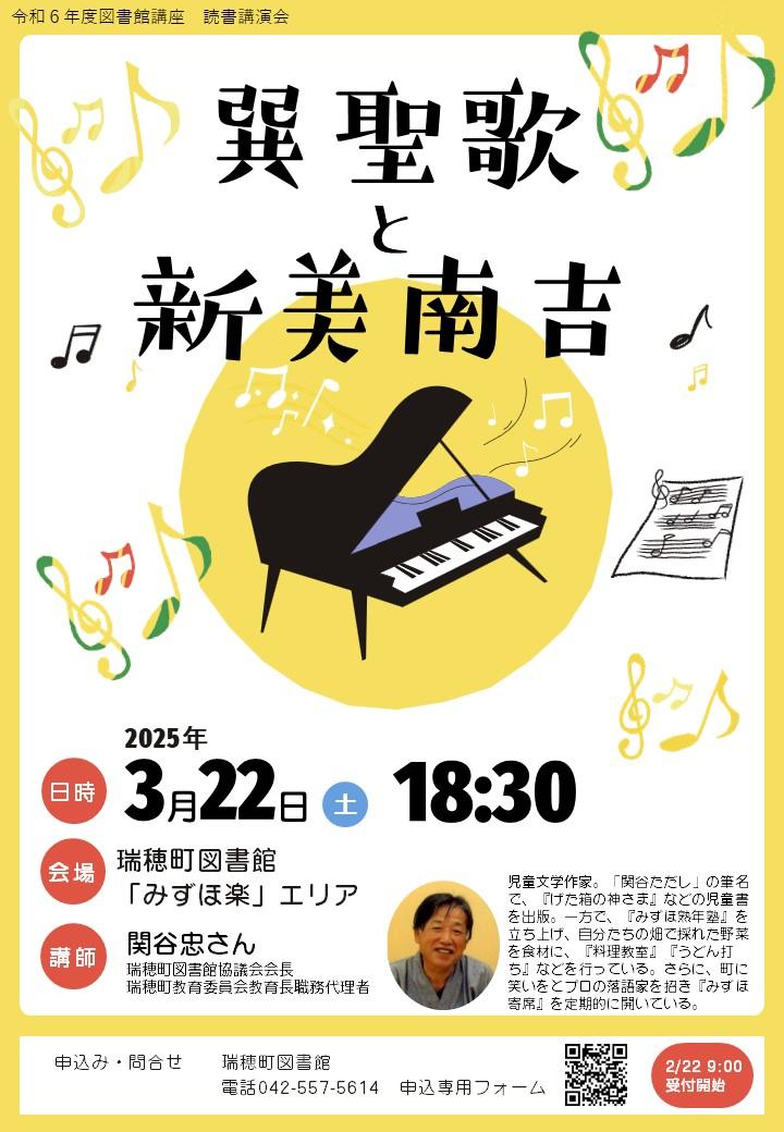 瑞穂町図書館電話 042-557-5614 または申し込みフォーム(外部リンク)2月22日(土曜日)午前9時から受付開始します。