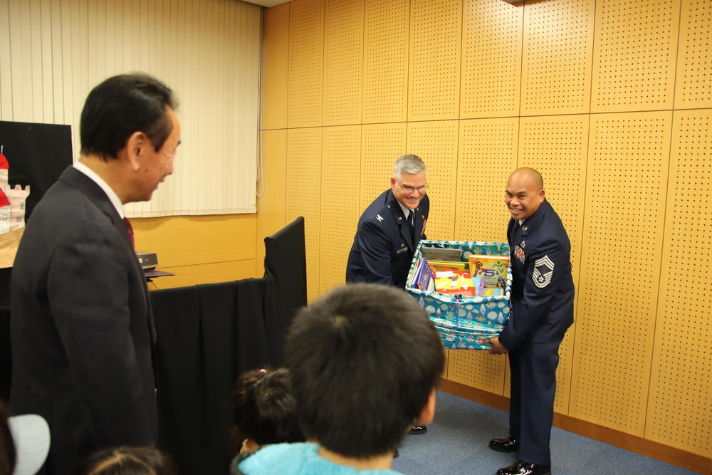 在日米軍横田基地第374整備群から瑞穂町に日頃の感謝のしるしとしてクリスマスのギフトを贈りたいという申し出があり、令和元年12月19日に開催された長岡コミュニティセンター図書室のクリスマス会で図書館に子ども向けの英語の図書が寄贈されました。