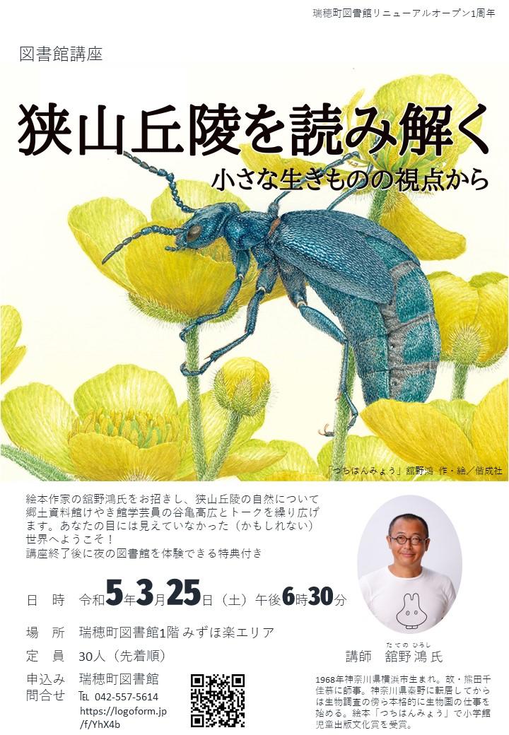 絵本作家の舘野鴻氏をお招きし、狭山丘陵の自然について郷土資料館けやき館学芸員の谷亀高広とトークを繰り広げます。あなたの目には見えていなかった(かもしれない)世界へようこそ!講座終了後に夜の図書館を体験できる特典付き