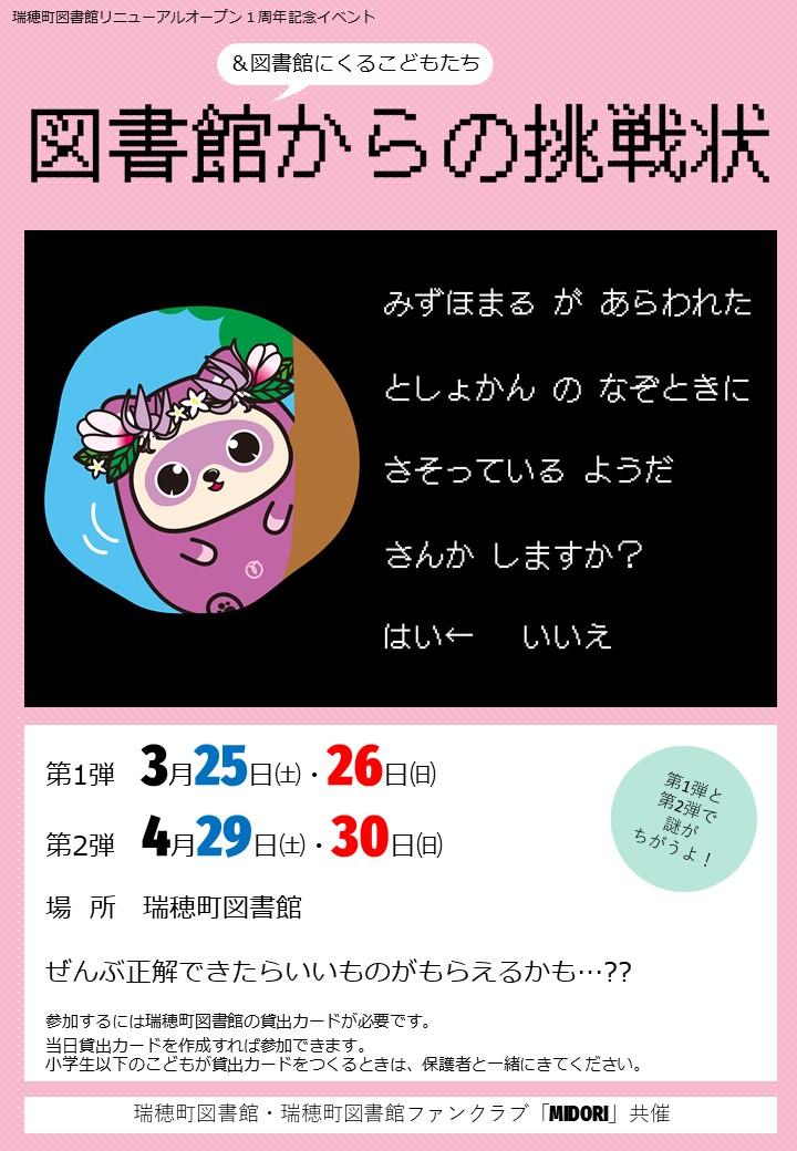 このイベントは、瑞穂町図書館と瑞穂町図書館ファンクラブ「MIDORI」との共催で実施します。