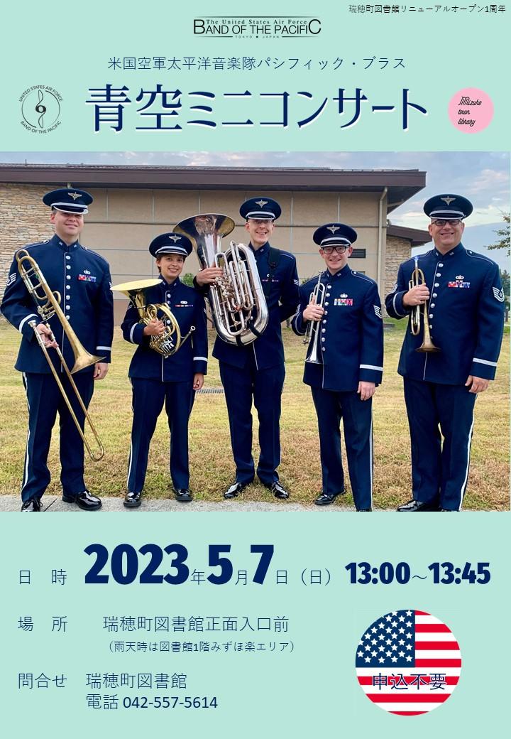 米国空軍太平洋音楽隊パシフィック・ブラスによる屋外でのミニコンサート(金管五重奏)を実施します。お誘いあわせの上、瑞穂町図書館にお出かけください。