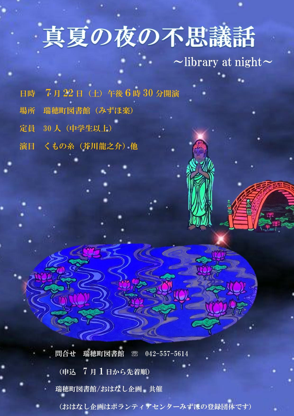 熱帯夜が続く真夏の夜に、ひんやりするお話やちょっと不思議なお話を楽しみに来ませんか?