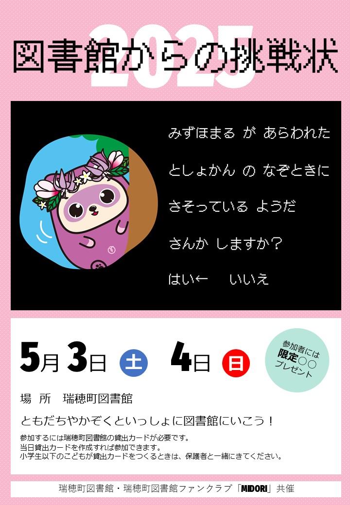 このイベントは、図書館ファンクラブ「MIDORI」と瑞穂町図書館の共催で実施します。